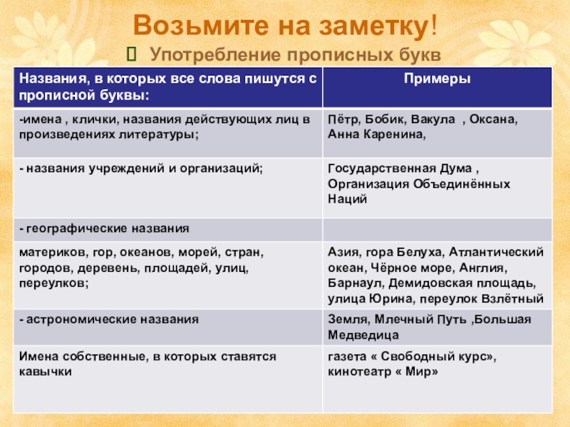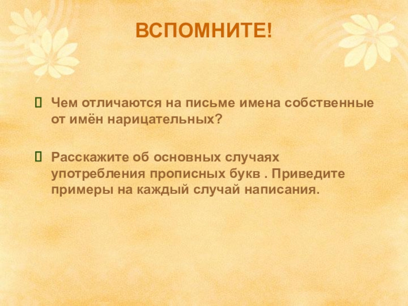 ВСПОМНИТЕ!Чем отличаются на письме имена собственные от имён нарицательных?Расскажите об основных случаях употребления прописных букв . Приведите