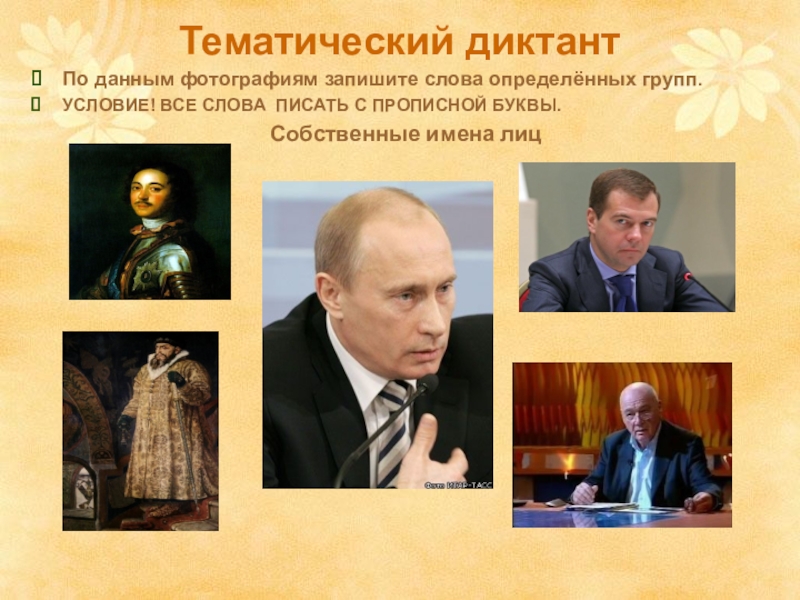 Тематический диктантПо данным фотографиям запишите слова определённых групп.УСЛОВИЕ! ВСЕ СЛОВА ПИСАТЬ С ПРОПИСНОЙ БУКВЫ. Собственные имена лиц