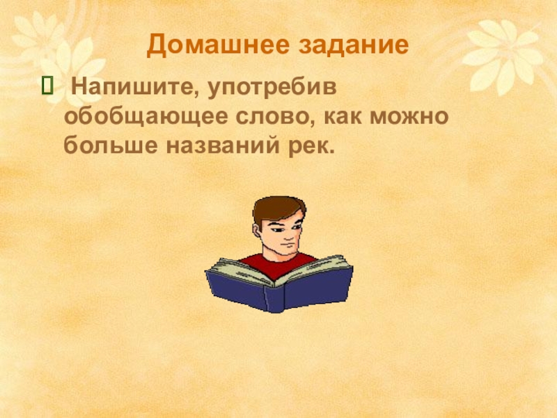 Домашнее задание Напишите, употребив обобщающее слово, как можно больше названий рек.