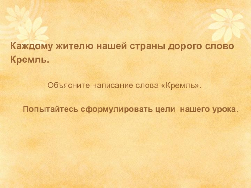 Каждому жителю нашей страны дорого словоКремль.Объясните написание слова «Кремль». Попытайтесь сформулировать цели нашего урока.