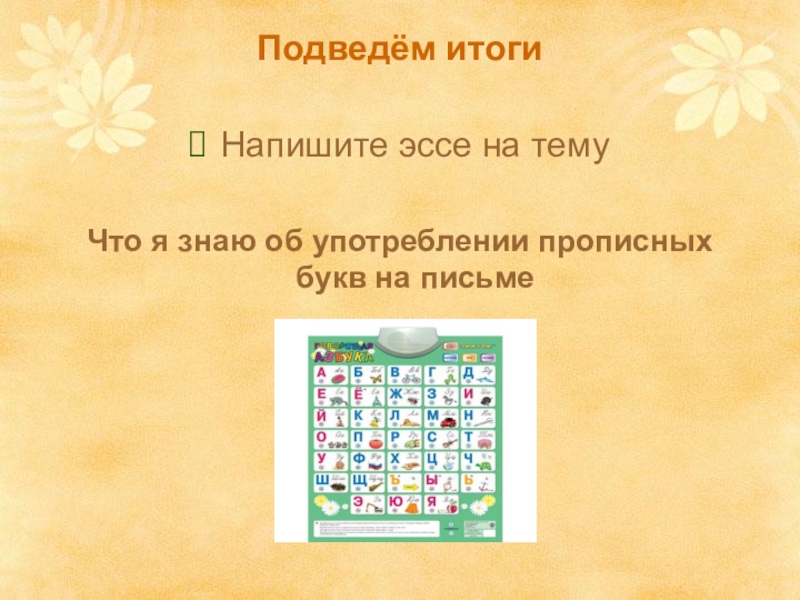 Подведём итогиНапишите эссе на тему	 Что я знаю об употреблении прописных букв на письме