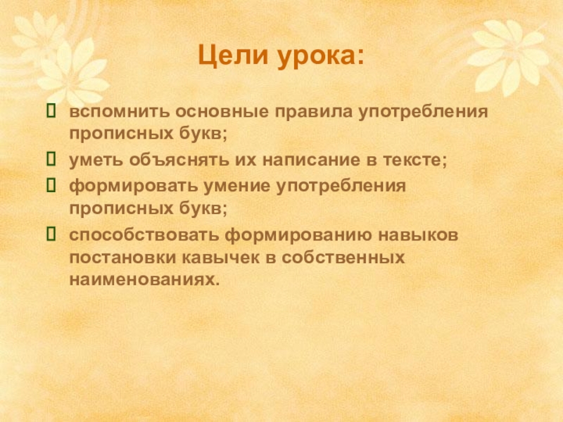 Цели урока:вспомнить основные правила употребления прописных букв;уметь объяснять их написание в тексте;формировать умение употребления прописных букв;способствовать формированию