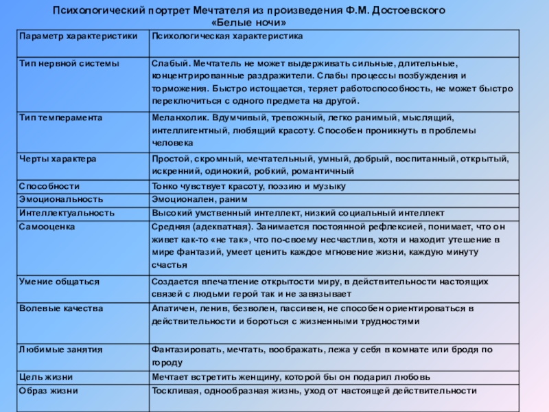 Слайд 8Психологический портрет Мечтателя из произведения Ф.М. Достоевского «Белые ночи»