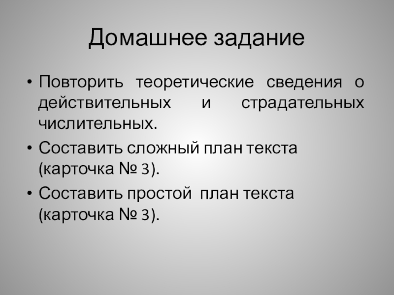 Домашнее заданиеПовторить теоретические сведения о действительных и страдательных числительных.Составить сложный план текста (карточка № 3).Составить простой план