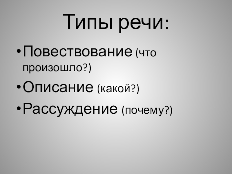 Типы речи:Повествование (что произошло?)Описание (какой?)Рассуждение (почему?)