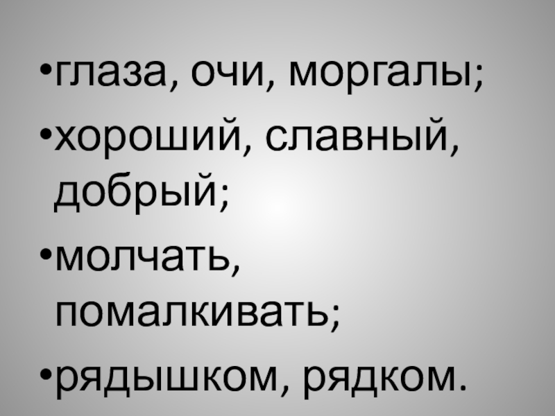 глаза, очи, моргалы;хороший, славный, добрый; молчать, помалкивать; рядышком, рядком.