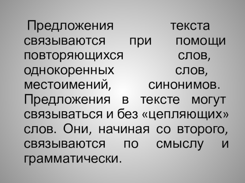 местоимений, синонимов. Предложения в тексте могут связываться и без «цепляющих» слов. Они, начиная со второго, связываются по смыслу и грамматически.