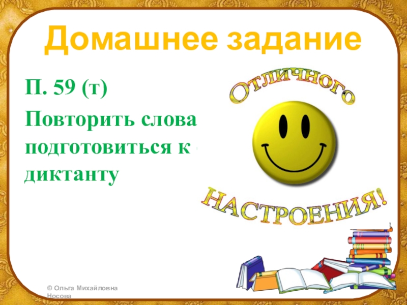 Домашнее заданиеП. 59 (т)Повторить словарные слова, подготовиться к словарному диктанту