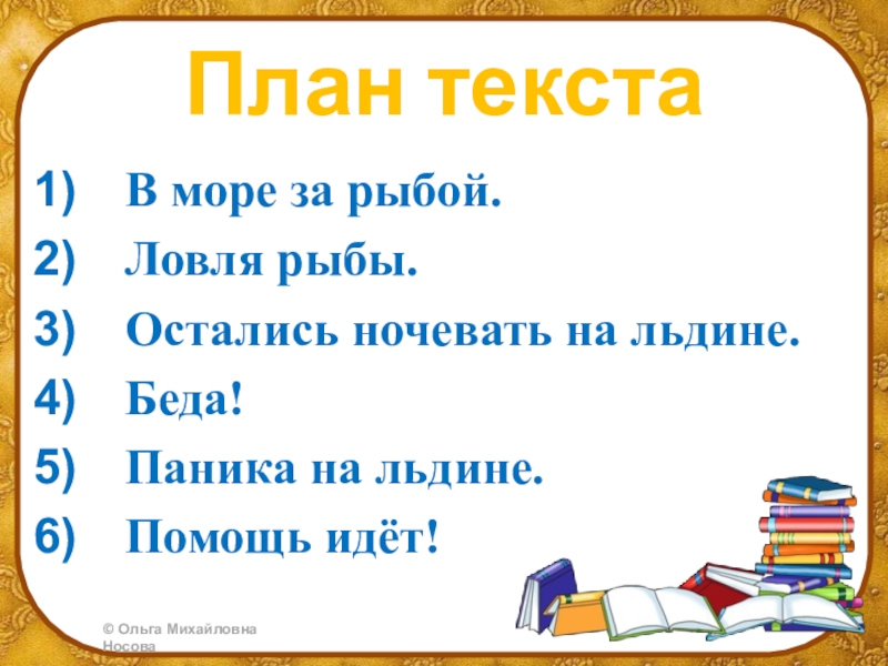 План текстаВ море за рыбой.Ловля рыбы.Остались ночевать на льдине.Беда!Паника на льдине.Помощь идёт!