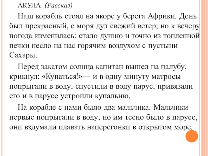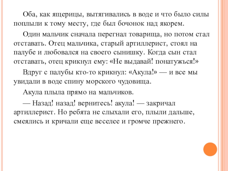 Мальчики сначала не слыхали того, что им кричали, и не видали акулы; но потом один из них оглянулся, и мы все услыхали пронзительный визг, и мальчики поплыли в разные стороны.