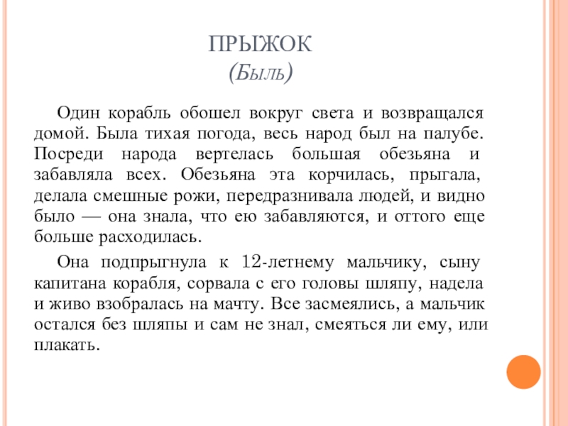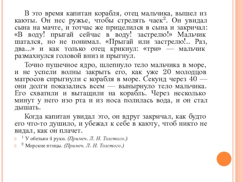 нес ружье, чтобы стрелять чаек2. Он увидал сына на мачте, и тотчас же прицелился в сына и закричал: «В воду! прыгай сейчас в воду! застрелю!» Мальчик шатался, но не понимал. «Прыгай или застрелю!.. Раз, два...» и как только отец крикнул: «три» — мальчик размахнулся головой вниз и прыгнул.