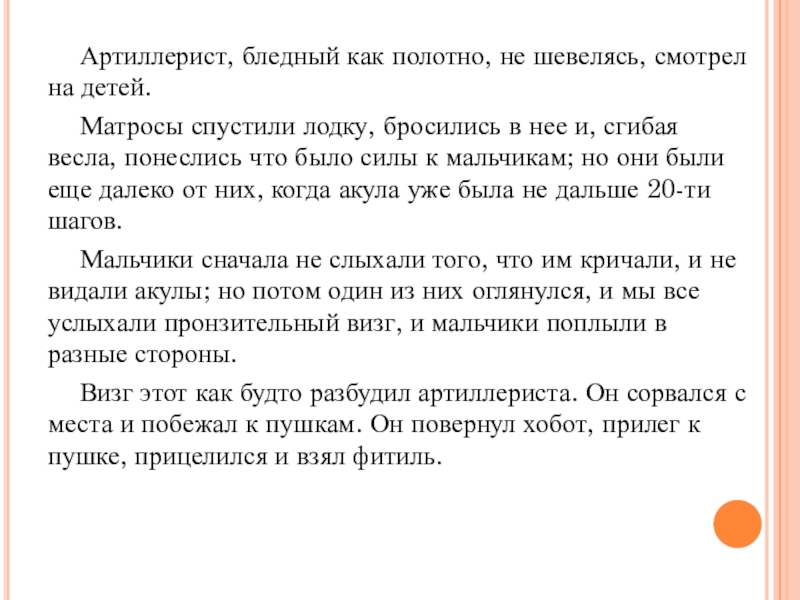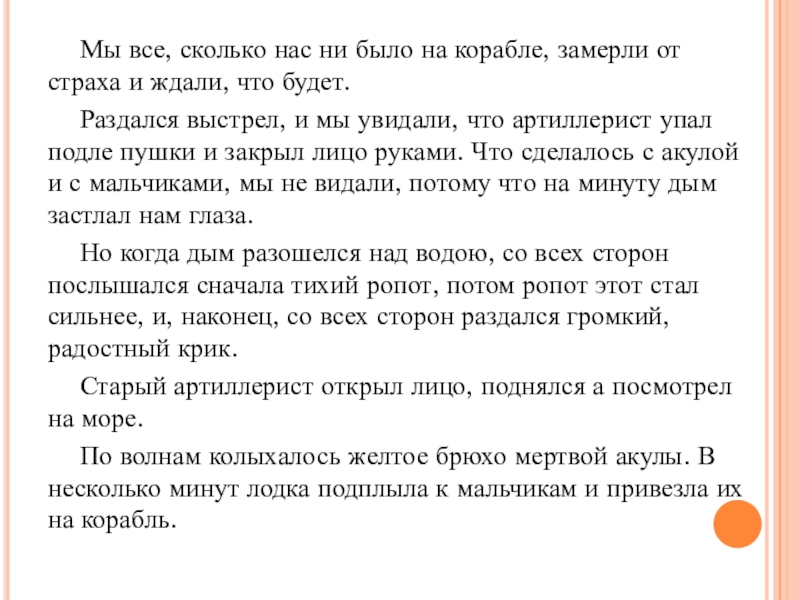 Раздался выстрел, и мы увидали, что артиллерист упал подле пушки и закрыл лицо руками. Что сделалось с акулой и с мальчиками, мы не видали, потому что на минуту дым застлал нам глаза.