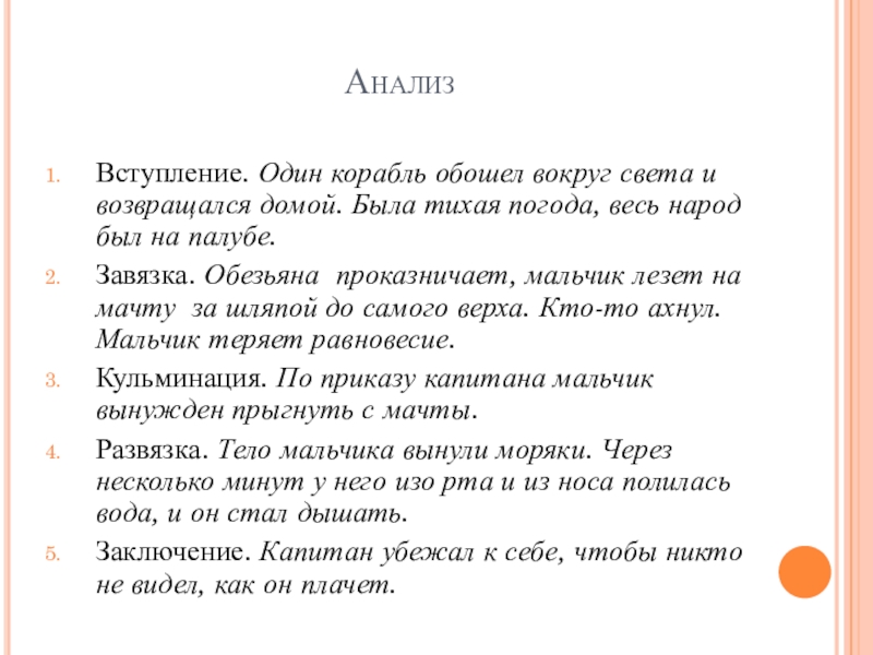 Завязка. Обезьяна проказничает, мальчик лезет на мачту за шляпой до самого верха. Кто-то ахнул. Мальчик теряет равновесие.