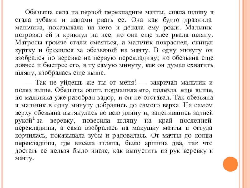 — Так не уйдешь же ты от меня! — закричал мальчик и полез выше. Обезьяна опять подманила его, полезла еще выше, но мальчика уже разобрал задор, и он не отставал. Так обезьяна и мальчик в одну минуту добрались до самого верха. На самом верху обезьяна вытянулась во всю длину и, зацепившись задней рукой1 за веревку, повесила шляпу на край последней перекладины, а сама взобралась на макушку мачты и оттуда корчилась, показывала зубы и радовалась. От мачты до конца перекладины, где висела шляпа, было аршина два, так что достать ее нельзя было иначе, как выпустить из рук веревку и мачту.