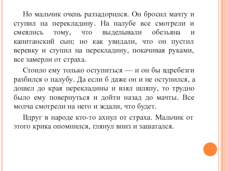 Слайд 8Но мальчик очень раззадорился. Он бросил мачту и ступил на перекладину.