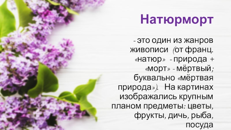 + «морт» - мёртвый; буквально «мёртвая природа»). На картинах изображались крупным планом предметы: цветы, фрукты, дичь, рыба, посуда