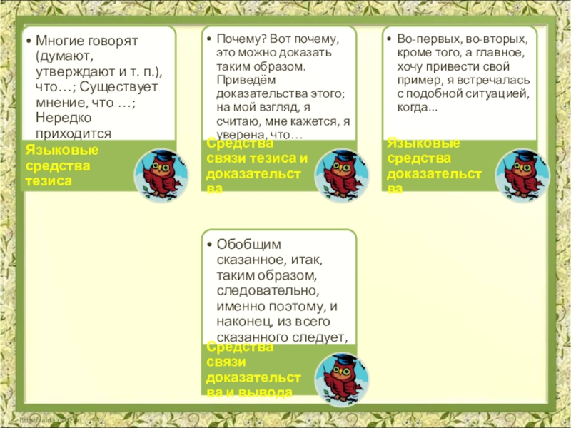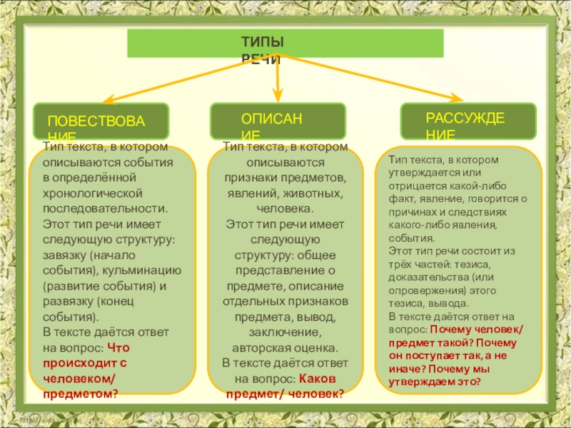 Этот тип речи имеет следующую структуру: общее представление о предмете, описание отдельных признаков предмета, вывод, заключение, авторская оценка.