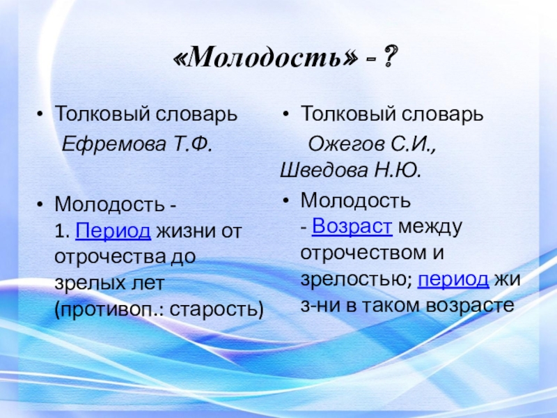 Молодость - Возраст между отрочеством и зрелостью; период жиз-ни в таком возрасте