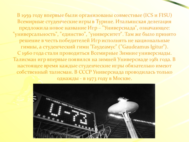 Слайд 12В 1959 году впервые были организованы совместные (ICS и FISU) Всемирные