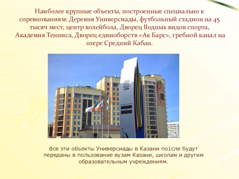 Слайд 29Наиболее крупные объекты, построенные специально к соревнованиям: Деревня Универсиады, футбольный стадион