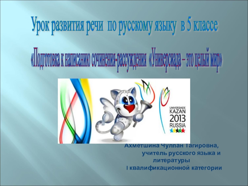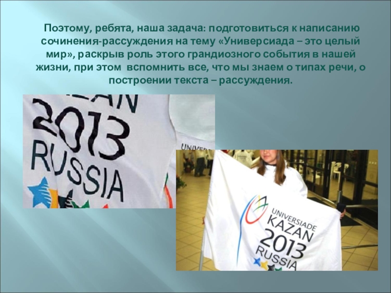 «Универсиада – это целый мир», раскрыв роль этого грандиозного события в нашей жизни, при этом вспомнить все, что мы знаем о типах речи, о построении текста – рассуждения.