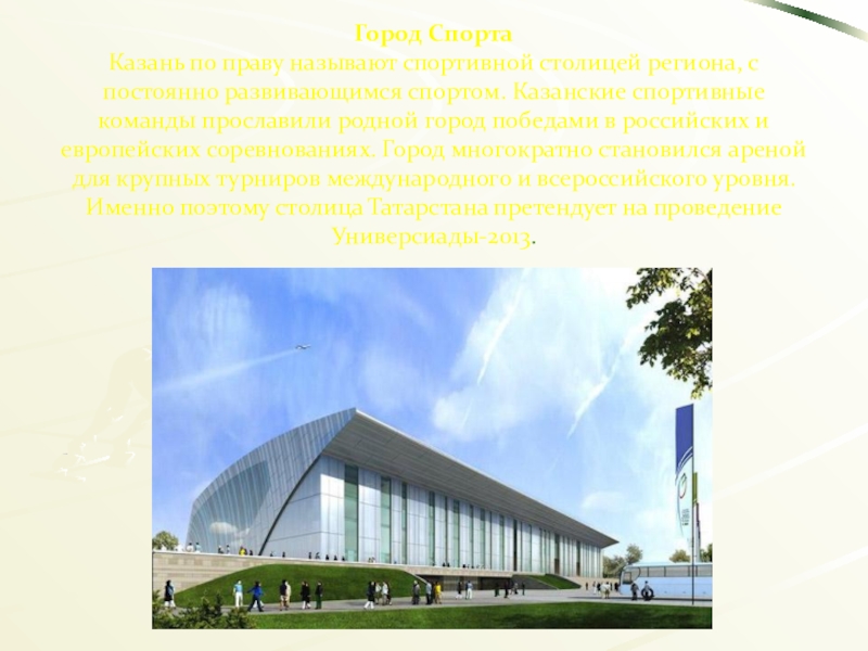 спортом. Казанские спортивные команды прославили родной город победами в российских и европейских соревнованиях. Город многократно становился ареной для крупных турниров международного и всероссийского уровня. Именно поэтому столица Татарстана претендует на проведение Универсиады-2013.