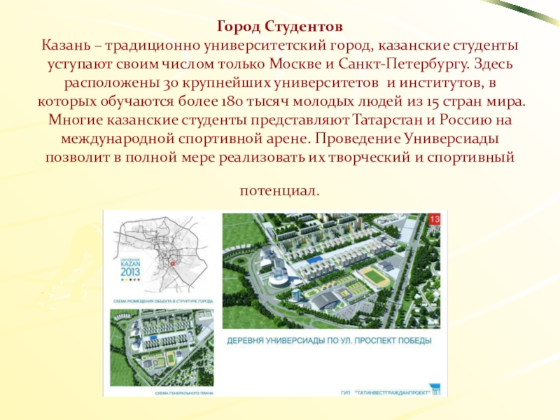 числом только Москве и Санкт-Петербургу. Здесь расположены 30 крупнейших университетов и институтов, в которых обучаются более 180 тысяч молодых людей из 15 стран мира. Многие казанские студенты представляют Татарстан и Россию на международной спортивной арене. Проведение Универсиады позволит в полной мере реализовать их творческий и спортивный потенциал.