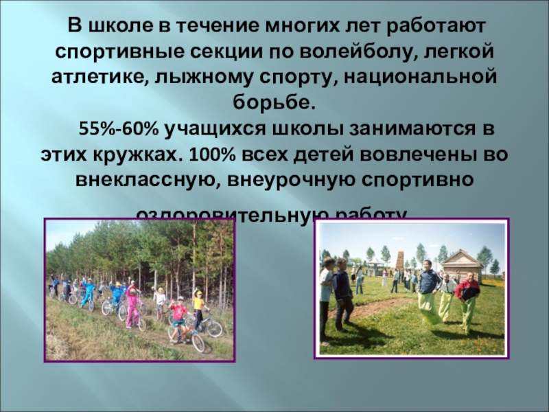 55%-60% учащихся школы занимаются в этих кружках. 100% всех детей вовлечены во внеклассную, внеурочную спортивно оздоровительную работу.