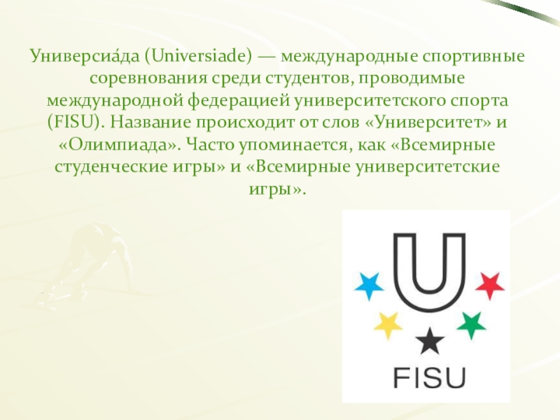 Слайд 14Универсиа́да (Universiade) — международные спортивные соревнования среди студентов, проводимые международной федерацией