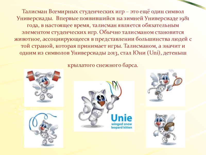 Слайд 17Талисман Всемирных студенческих игр – это ещё один символ Универсиады. Впервые