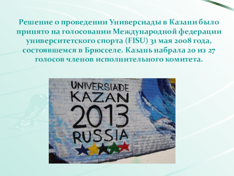 Слайд 27Решение о проведении Универсиады в Казани было принято на голосовании Международной