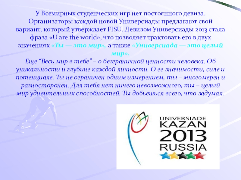 предлагают свой вариант, который утверждает FISU. Девизом Универсиады 2013 стала фраза «U are the world», что позволяет трактовать его в двух значениях «Ты — это мир», а также «Универсиада — это целый мир».