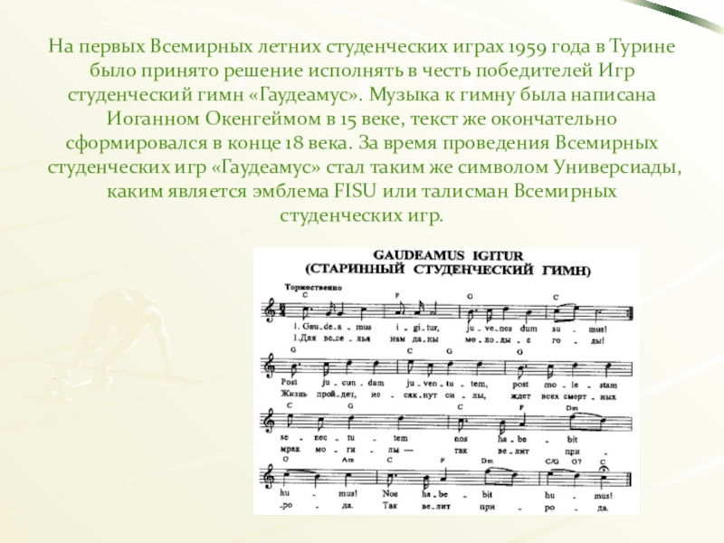 студенческие игры в Турине. Итальянская делегация предложила новое название Игр – "Универсиада", означающее: "универсальность", "единство", "университет". Там же было принято решение в честь победителей Игр исполнять не национальные гимны, а студенческий гимн "Гаудеамус" ("Gaudeamus Igitur").