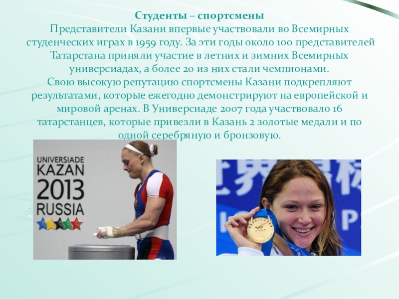 1959 году. За эти годы около 100 представителей Татарстана приняли участие в летних и зимних Всемирных универсиадах, а более 20 из них стали чемпионами.