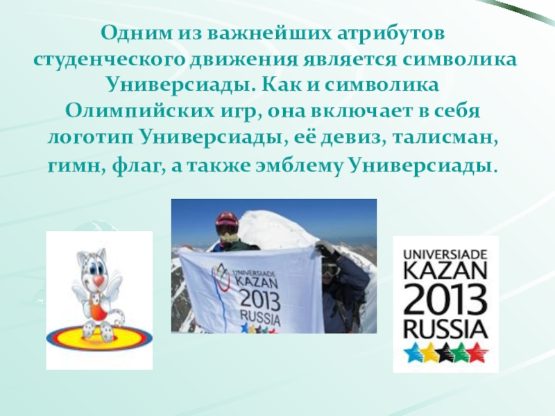 Слайд 15Одним из важнейших атрибутов студенческого движения является символика Универсиады. Как и