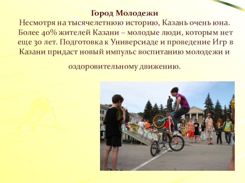 жителей Казани – молодые люди, которым нет еще 30 лет. Подготовка к Универсиаде и проведение Игр в Казани придаст новый импульс воспитанию молодежи и оздоровительному движению.