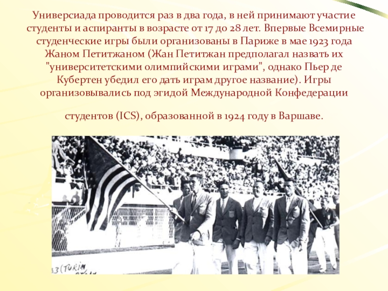 и аспиранты в возрасте от 17 до 28 лет. Впервые Всемирные студенческие игры были организованы в Париже в мае 1923 года Жаном Петитжаном (Жан Петитжан предполагал назвать их "университетскими олимпийскими играми", однако Пьер де Кубертен убедил его дать играм другое название). Игры организовывались под эгидой Международной Конфедерации студентов (ICS), образованной в 1924 году в Варшаве.