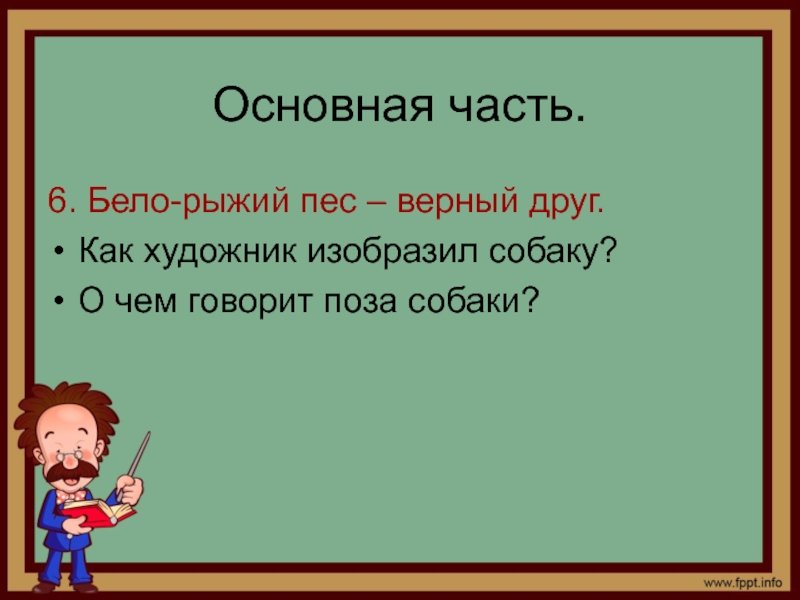 Основная часть.6. Бело-рыжий пес – верный друг.Как художник изобразил собаку?О чем говорит поза собаки?