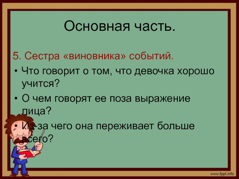 Основная часть.5. Сестра «виновника» событий.Что говорит о том, что девочка хорошо учится?О чем говорят ее поза выражение