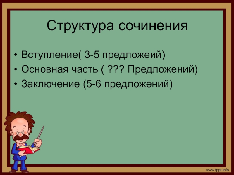 Структура сочиненияВступление( 3-5 предложеий)Основная часть ( ??? Предложений)Заключение (5-6 предложений)