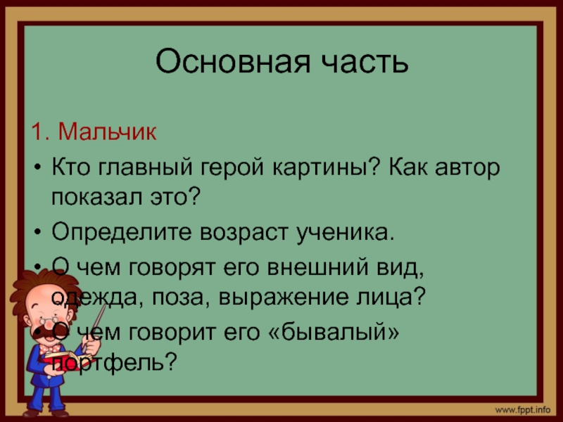 Основная часть1. МальчикКто главный герой картины? Как автор показал это?Определите возраст ученика.О чем говорят его внешний вид,