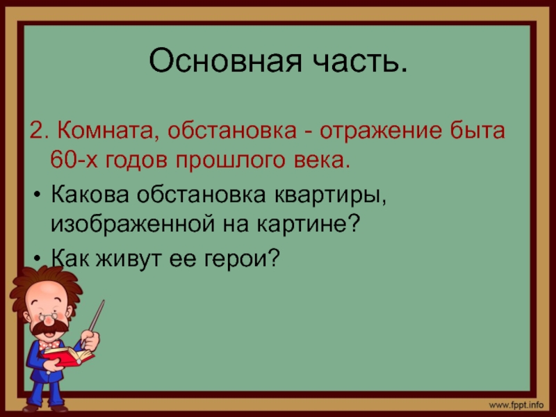 Основная часть.2. Комната, обстановка - отражение быта 60-х годов прошлого века.Какова обстановка квартиры, изображенной на картине?Как живут