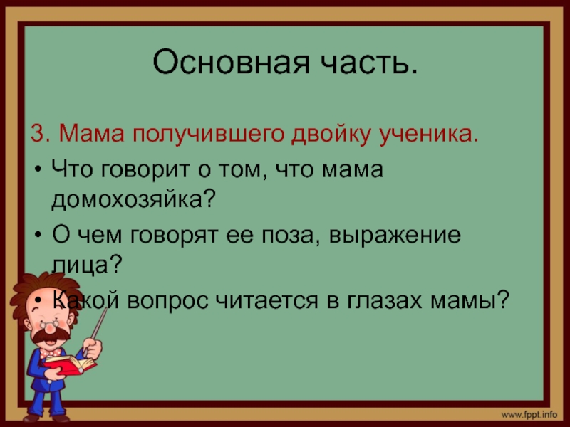 Основная часть.3. Мама получившего двойку ученика.Что говорит о том, что мама домохозяйка?О чем говорят ее поза, выражение