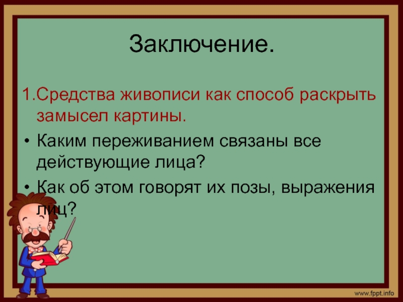 Заключение. 1.Средства живописи как способ раскрыть замысел картины.Каким переживанием связаны все действующие лица?Как об этом говорят их