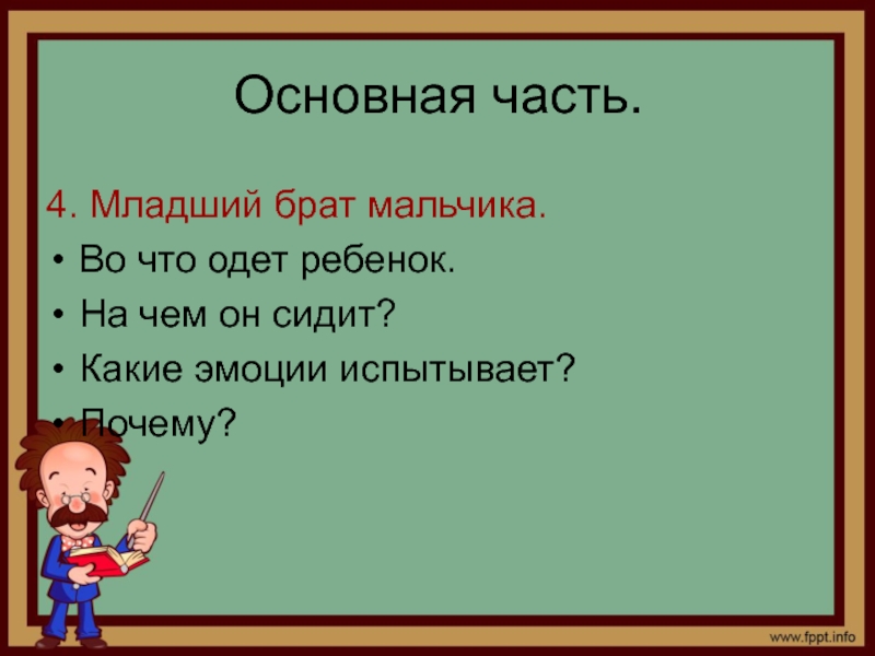 Основная часть.4. Младший брат мальчика.Во что одет ребенок.На чем он сидит?Какие эмоции испытывает?Почему?