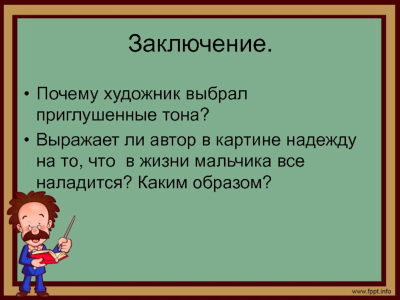 Заключение. Почему художник выбрал приглушенные тона?Выражает ли автор в картине надежду на то, что в жизни мальчика