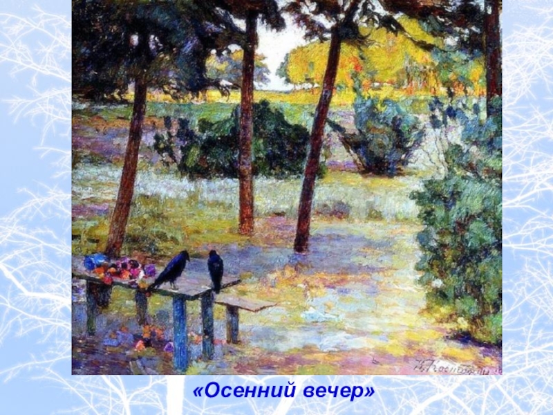 чувство покоя и умиротворения. «Удивительное рядом!» — такой эпиграф можно подобрать к картине Н.П.Крымова. Художник любуется вечерними сумерками. Он хочет показать, как же прекрасна наша русская природа!
