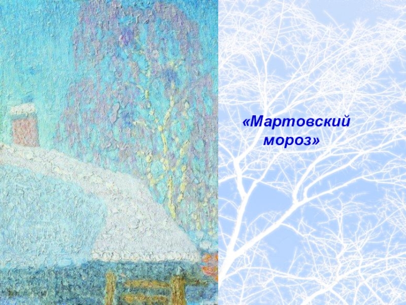 Художник использовал в основном холодные цвета: голубой, серовато-голубой, серебристо-синий цвет снега, зеленовато-серый цвет неба, которые передают ощущение морозного вечера. Но употребил и теплые цвета: рыжевато-коричневые деревья; желтовато-коричневые стены домов и сараев; желтоватый отблеск окон, освещенных солнцем. Эти цвета передают ощущение уюта, спокойствия, тепла.