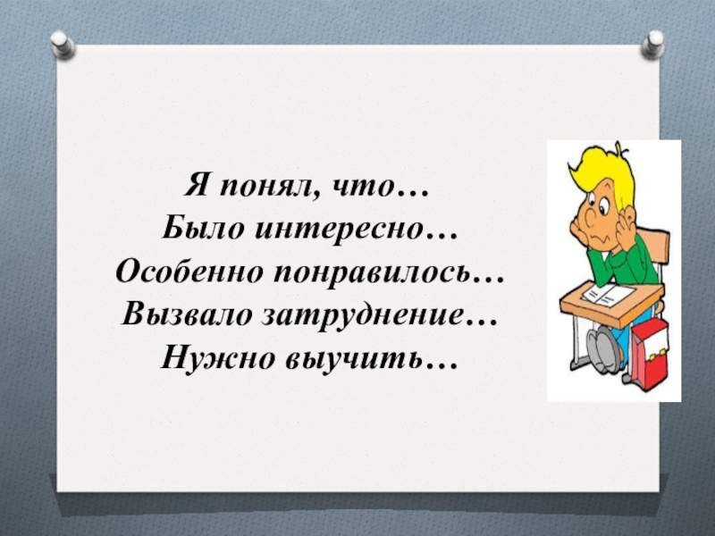 Я понял, что… Было интересно… Особенно понравилось… Вызвало затруднение… Нужно выучить…