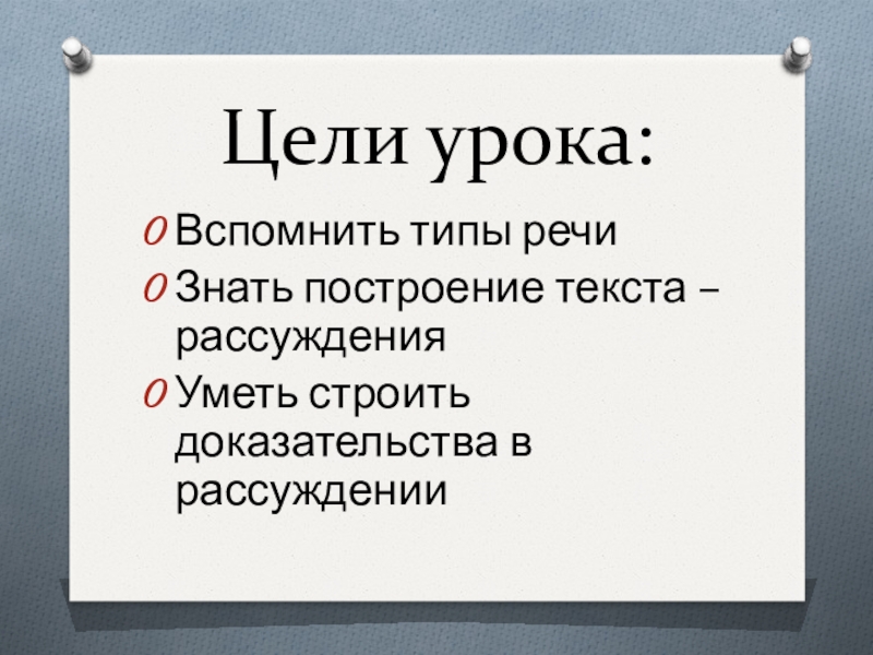Цели урока:Вспомнить типы речиЗнать построение текста –рассужденияУметь строить доказательства в рассуждении